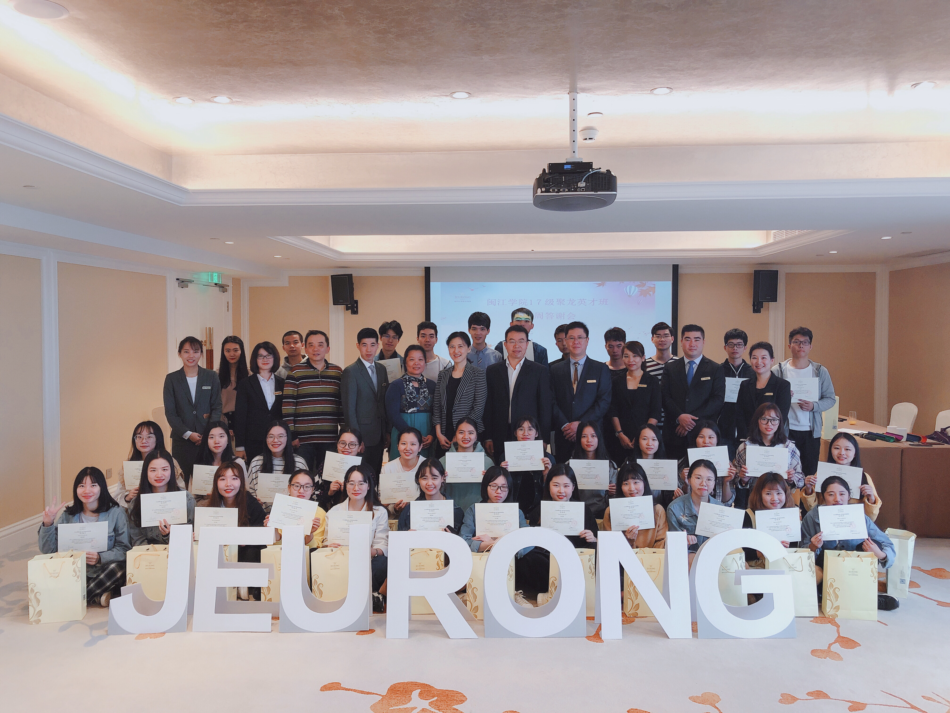 在实践周尾声的答谢会中,聚龙酒店总经理银仲奎先生通过自身经历来激励同学们不懈奋斗,酒管中心总经理林芳女士也对本次实践周聚龙英才班同学的表现给予了肯定,并表示期待更多的闽江学子日后能够加入聚龙,共筑聚龙。