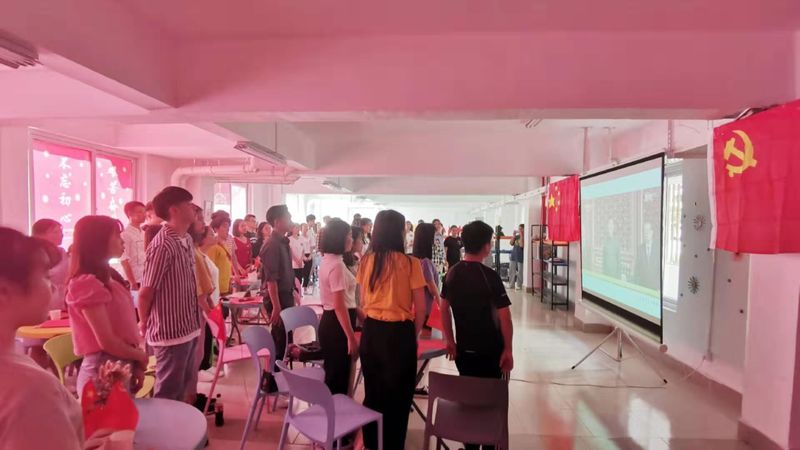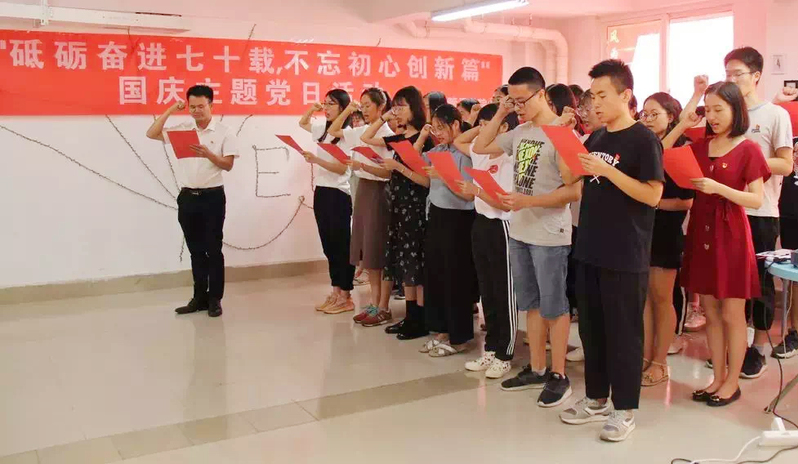 会后,所有党员面向党旗,举右手握拳,庄严宣誓:“我志愿加入中国共产党……,永不叛党。”赖荣鹏老师强调:“人的一生可能会做出多次承诺,对于一个共产党员来说,在党旗下宣誓无疑是最神圣、最庄严的,入党誓词就是一名党员的座右铭,是行动指南,它表明了一个共产党人为实现人生最高价值所作出的无悔选择。”活动在慷慨激昂的《义勇军进行曲》中结束。