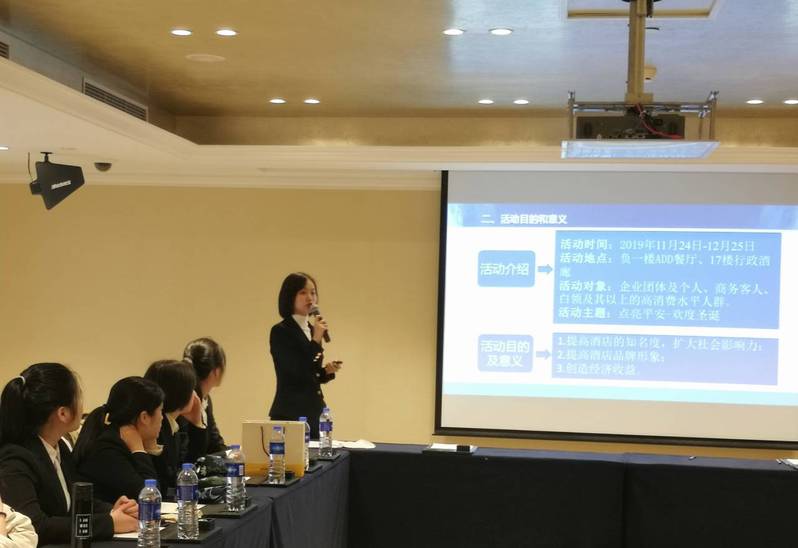 五组课题结题答辩的员工依次上台阐述,期间由酒店专家进行提问,并给出专业的修改意见和点评,为各组进行打分。参与课题结题答辩的同学热情地向大家展示两个多月来的研究成果,细致地考虑到项目策划中每一个细节及具体实施办法。答辩会结束后,聚龙酒店总经理银仲奎先生在会后的点评中也对同学们创新的想法和认真的态度给予了充分的肯定和赞扬。