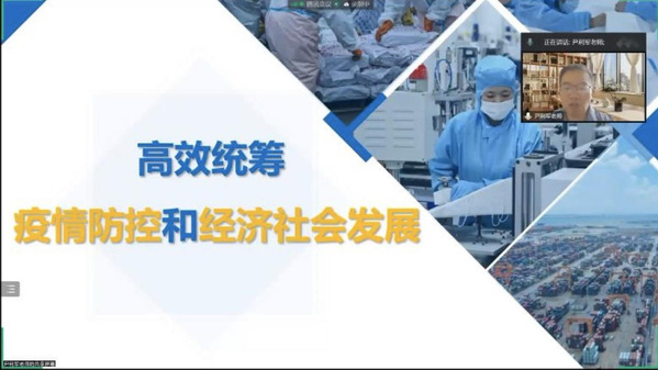 尹利军副经理以《高效统筹疫情防控和经济社会发展》为主题,从疫情防控措施科学有效、经济社会发展稳中向好、坚定夺取双胜利的信心等三个方面,结合实际和专业知识为同学们授课。尹利军以各方疫情防控措施为例,表示要坚持“外防输入、内防反弹”的总策略和“动态清零”的总方针,积极运用政治、财政等措施促进经济的发展,在疫情之下实现经济正增长。要正确认识疫情防控“九不准”,不断提升分区分级差异化精准防控水平,保障各项安全,保持经济社会的稳定适当增长。