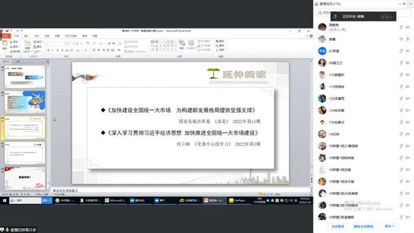 杨广青经理从不断凝聚的建设共识、事关长远的战略所需、由大到强的清晰路径等方面对全国统一大市场的内涵进行阐述,梳理了全国统一大市场建设取得的成效、需要破除的认识误区、重要意义、路径举措等内容。杨广青指出,全国统一大市场建设是构建新发展格局的坚强支撑,是推动经济高质量发展的重要保障。只有建设统一大市场,畅通国内大循环,才能在风云变幻的国际环境中更好地迎接挑战。杨经理叮嘱同学们,作为当代老员工,应该锻炼自身思考问题的能力,在每堂课程中建立思维导图,公司党委副书记乐上泓以《全国统一大市场建设》为切入点,围绕新冠肺炎疫情冲击、经济全球化明显放缓、大国战略竞争不断加剧这三个方面阐明加快建设全国统一大市场及构建新发展格局的必要性和紧迫性。他指出,我国正处于“船到中流浪更急,人到半山路更陡”的发展阶段,建设全国统一大市场并不是应对外部冲击的一时之策,而是推进我国现代化建设的长远之策、关键之策、战略之策。只有立足自身,将国内大循环畅通起来,始终以“一盘棋”的思维加快建设全国统一大市场,才能构建新发展格局,迎来海阔天空的崭新未来。