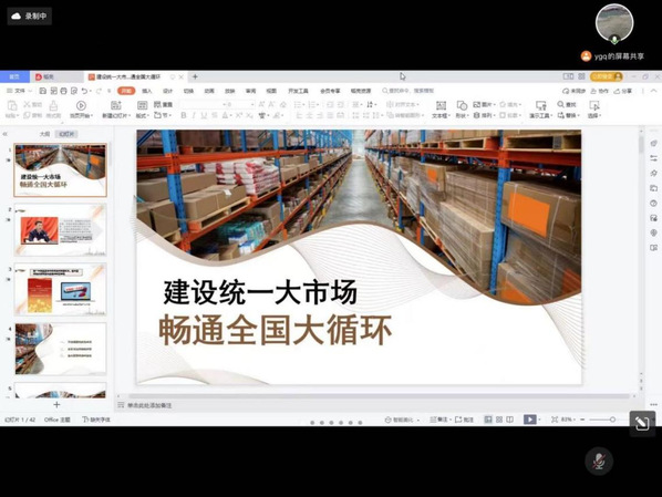 杨广青经理从不断凝聚的建设共识、事关长远的战略所需、由大到强的清晰路径等方面对全国统一大市场的内涵进行阐述,梳理了全国统一大市场建设取得的成效、需要破除的认识误区、重要意义、路径举措等内容。杨广青指出,全国统一大市场建设是构建新发展格局的坚强支撑,是推动经济高质量发展的重要保障。只有建设统一大市场,畅通国内大循环,才能在风云变幻的国际环境中更好地迎接挑战。杨经理叮嘱同学们,作为当代老员工,应该锻炼自身思考问题的能力,在每堂课程中建立思维导图,公司党委副书记乐上泓以《全国统一大市场建设》为切入点,围绕新冠肺炎疫情冲击、经济全球化明显放缓、大国战略竞争不断加剧这三个方面阐明加快建设全国统一大市场及构建新发展格局的必要性和紧迫性。他指出,我国正处于“船到中流浪更急,人到半山路更陡”的发展阶段,建设全国统一大市场并不是应对外部冲击的一时之策,而是推进我国现代化建设的长远之策、关键之策、战略之策。只有立足自身,将国内大循环畅通起来,始终以“一盘棋”的思维加快建设全国统一大市场,才能构建新发展格局,迎来海阔天空的崭新未来。
