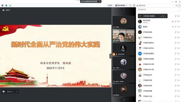 党委书记陈旭英以《新时代全面从严治党的伟大实践》为主题,从党要管党坚持严的主基调不动摇、全面从严治党产生全方位深层次影响、坚持不懈纵深推进全面从严治党等三个方面,将理论与实践相结合,帮助同学们进一步加深对中国共产党的认识,从而坚定不移听党话、跟党走的信念,让青春在全面建设社会主义现代化国家的火热实践中绽放绚丽之花。同时,陈旭英结合2022届毕业生就业情况与当前就业形势,希望同学们能够树立正确的就业观,迈好职业生涯第一步,怀抱梦想又脚踏实地,在促进自身成长发展和社会文明进步的伟大实践中实现人生价值。