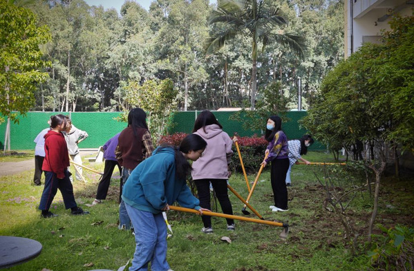 在心理辅导站指导老师周敏琳与工作人员的带领下,同学们在一区四劳动教育基地,按照分工区域,齐心协力,卖力苦干,用满满的热情和辛勤的汗水,为小树营造温馨家园。
