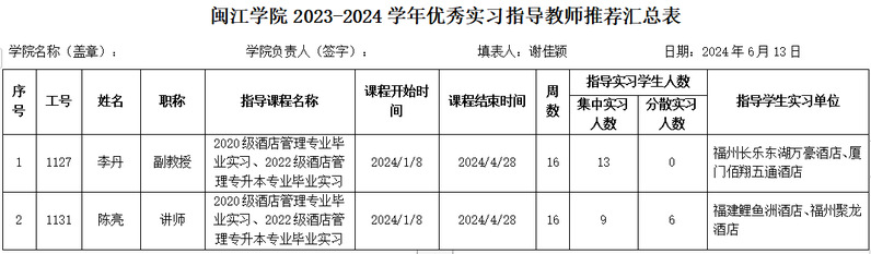 根据校教务处初审意见,公司对2023-2024学年优秀实习指导教师推荐名单进行调整,拟推荐李丹、陈亮等2位教师2023-2024学年申报优秀实习指导教师,现予公示。