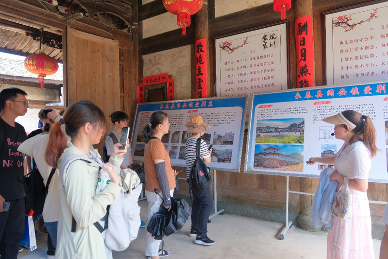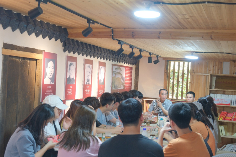 实践队来到永泰县爱荆庄,爱荆庄独特的建筑艺术价值让队员们了解到庄主鲍美祚夫妻的建筑理念、教书育人事迹。爱荆庄位于茶叶产业强镇永泰县同安镇,庄寨中设有侨企元泰茶业有限公司董事长魏文生建设的茶驿站,驿站中挂着魏文生夫妇为驿站的题词“书香茶香进入我乡”。魏文生夫妇一直致力于讲好中国茶故事,通过茶,透过侨,将家乡福州推向世界。队员们在驿站中感受茶文化与庄寨文化融合发展碰撞出的火花。
