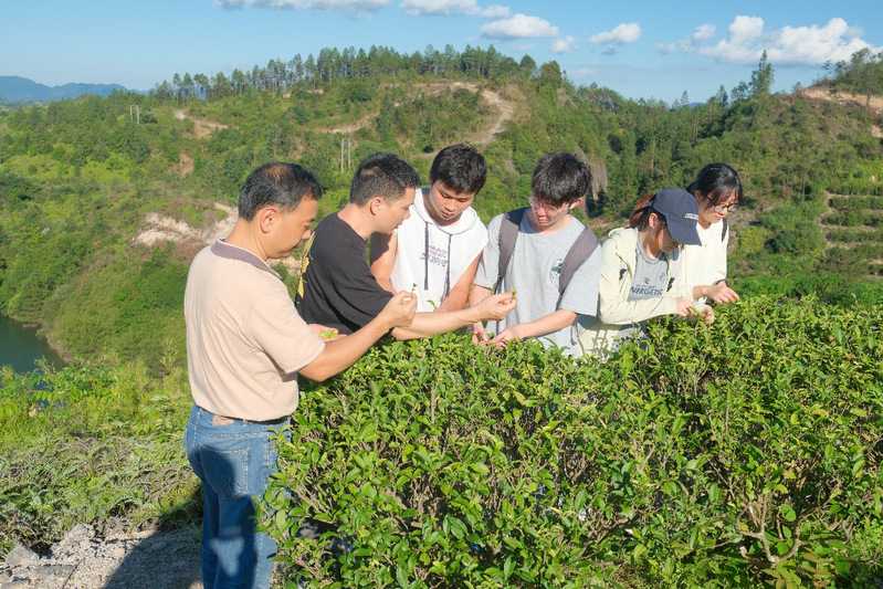 据悉,福建元泰茶业有限公司,是由华侨魏文生先生投资兴建的茶叶企业,以其独特的侨建兴农模式,在乡村振兴中发挥了重要作用。实践队也来到了元泰公司在永泰县联坪村设立的“张天福有机茶叶生产基地”。魏文生先生带领实践队走入茶园,示范如何采摘茶叶并讲述了他们是如何利用有机茶园周边的“尖山水库”,推动茶业与生态融合发展。实践队员们走进茶地,学习如何采摘茶叶,感受劳动带来的快乐。