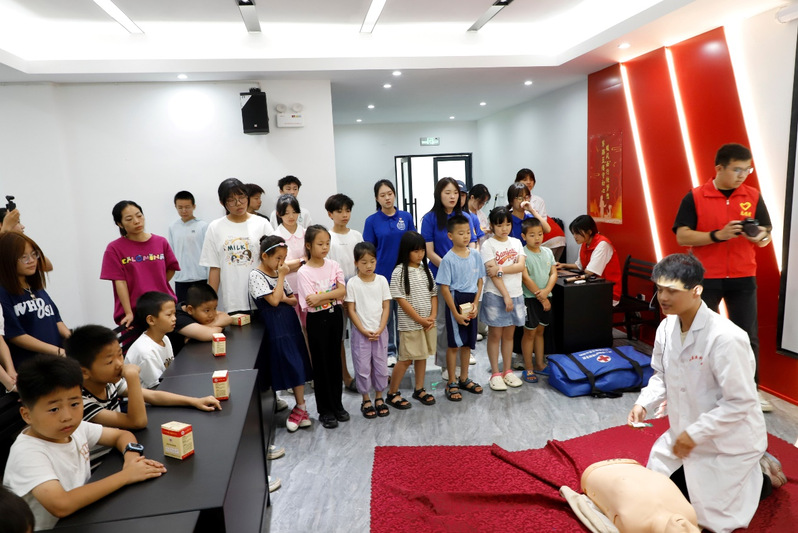 暖风支教团联合医科大实践队为参加支教夏令营的同学们带来一堂生动的急救知识课,开展心肺复苏、AED的使用、烧烫伤急救、鼻出血处理等急救技能的教学。培训过程中,双方队员们详细讲解了各项技能的操作流程和注意事项,并通过模拟场景让员工们进行实操演练。现场气氛热烈,大家认真听讲、仔细学习,踊跃尝试进行现场演习。经过双方队员的耐心指导和规范操作,小朋友们初步掌握了急救基本知识和技能,进一步增强了大家在紧急情况下的自救互救能力,提高了筑牢生命安全防线的意识。