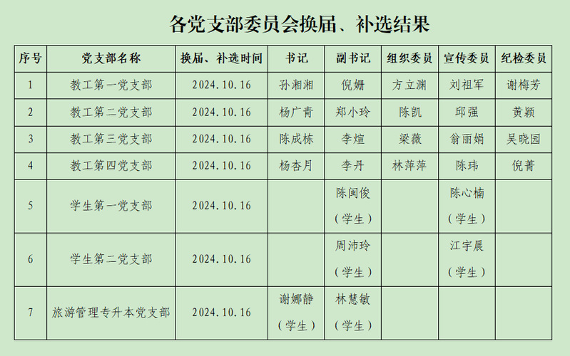 3个员工党支部委员会召开补选大会。员工第一党支部、员工第二党支部通过党员大会以无记名投票和差额选举的方式,各补选了2名支部委员会员工委员,分别召开支部委员会会议等额补选产生了副书记各1人。旅游管理专升本党支部召开支部委员会会议等额补选产生了书记、副书记各1人。