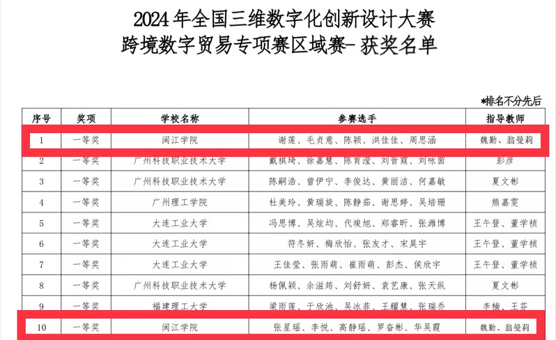 在2024年全国三维数字化创新设计大赛跨境数字贸易专项赛区域赛中,由魏勤和翁曼丽两位老师指导的WilliamHill体育两支代表队均荣获一等奖,其中一支队伍成功晋级全国总决赛。