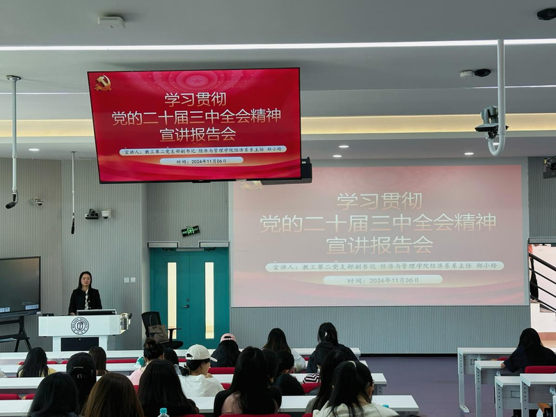11月6日,公司教工第二党支部副书记、经济系主任郑小玲老师为团支部成员开讲“学习贯彻党的二十届三中全会精神”主题宣讲,团支部同学全员参加,认真听讲,积极讨论,进一步学习理解党的二十届三中全会精神,坚定理想信念,明确奋斗目标。