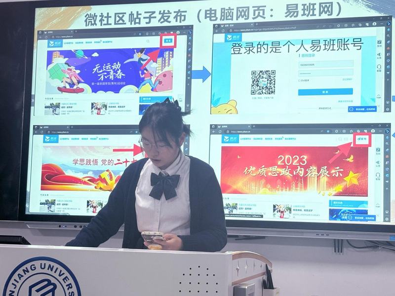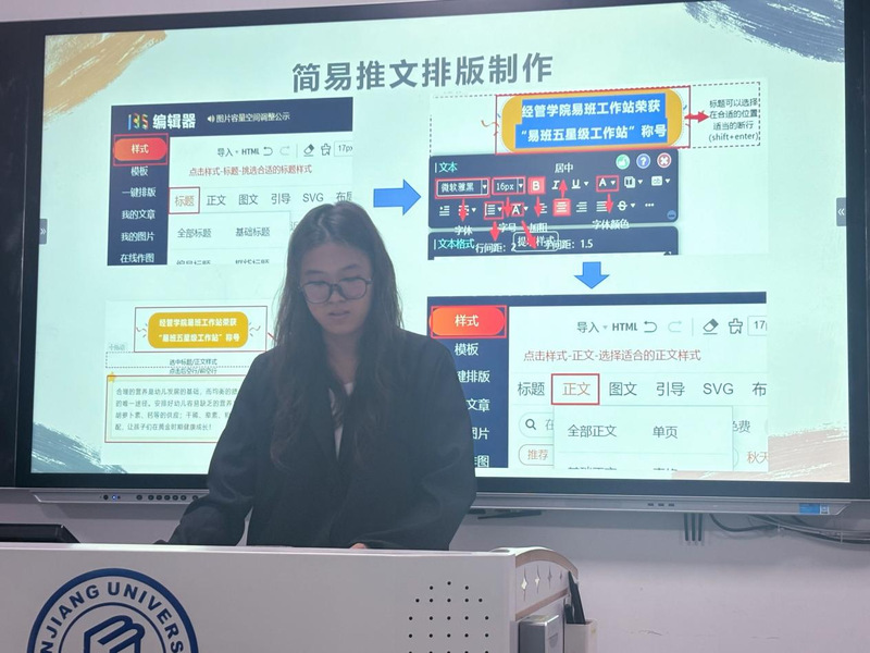 钟嘉洋详细解读了大赛文件,具体介绍了比赛流程、重要时间节点、评分细则等信息。副站长张语秋、夏远雪分别就易班社区建设、轻应用平台搭建、推文排版等要点开展教学培训。培训会还邀请到2023年易班超级新生大赛获奖班级负责人到场分享,通过展示比赛汇编材料、讲解比赛注意事项,为新生们提供了宝贵的经验启示。