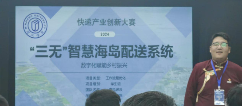 总决赛期间,大赛组织委员会组织了“创投赋能,育苗成长”——快递产业创新大赛优秀项目推介会,为优质项目与投资机构之间搭建高效对接平台。2023级物流工程班赛昂普布同学代表“乘风破浪队”向氪星创服、中经合、栖云投资、东方飞马等创服机构以及邮政、顺丰、韵达等快递企业推介参赛作品“三无”智慧海岛配送系统。一声藏语问候,结合创意十足的数字赋能海岛乡村配送方案,引起创投机构与邮政快递业界代表对公司参赛作品的浓厚兴趣。