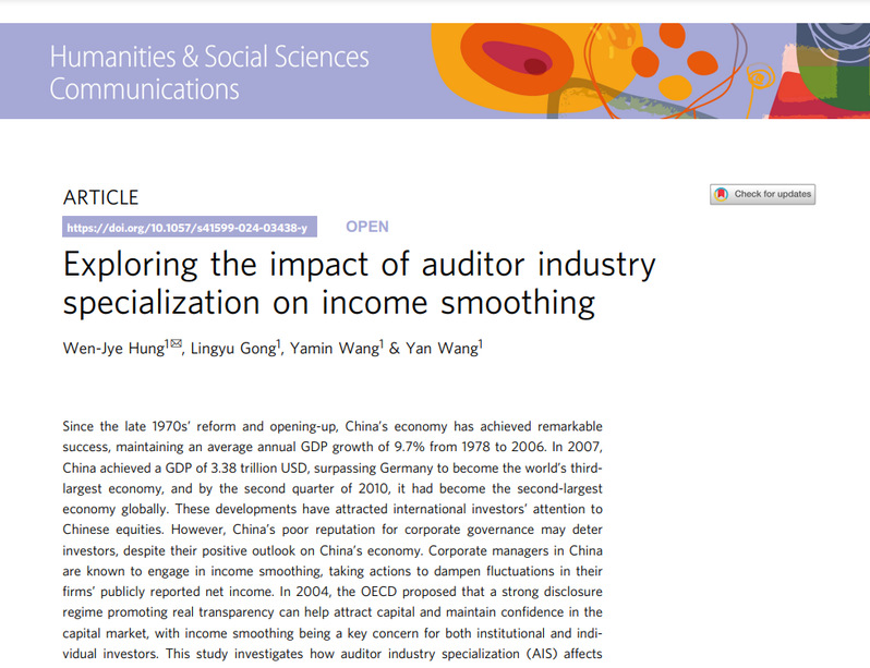 近日,WilliamHill体育洪文杰教授带领与指导的员工团队在财务管理研究领域取得重要突破。洪文杰教授作为通讯作者,2022级税收学专业王雁同学和公司毕业员工龚灵宇和王雅敏作为第一作者,共同完成的论文《Exploring the impact of auditor industry specialization on income smoothing》,历经两年的修改与完善,最终在Nature旗下唯一的人文社会学科类子刊《Humanities and Social Sciences Communications》发表。