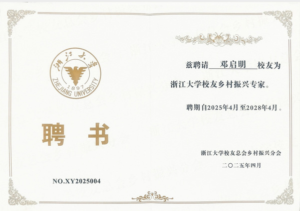 4月12日,浙江大学员工总会乡村振兴分会2025年年会暨第二届浙江大学员工乡村振兴论坛在浙江大学紫金港校区举行,公司邓启明教授受聘为浙江大学员工乡村振兴专家。