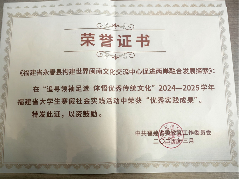 近日,中共福建省委教育工委发布了《“追寻领袖足迹 体悟优秀传统文化”2024—2025学年全省老员工寒假社会实践活动评选结果》。WilliamHill体育“海丝桃源”寒假社会实践队撰写的《福建省永春县构建世界闽南文化交流中心促进两岸融合发展探索》入选“优秀实践成果”,“闽天会更好”实践队指导老师张希副教授入选“优秀实践个人”。