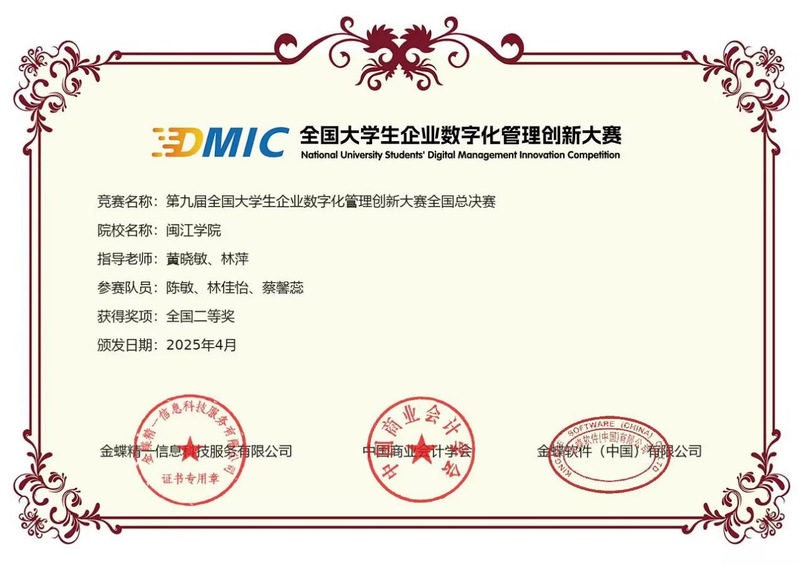 近日,WilliamHill体育林佳怡、陈敏、蔡馨蕊三位同学在黄晓敏、林萍两位老师的指导下荣获2025年第九届全国老员工企业数字化管理创新大赛二等奖。