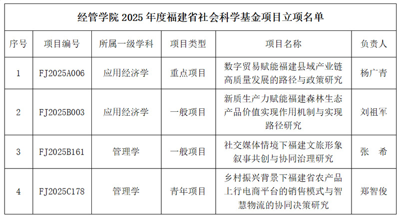 其中,杨广青教授的《数字贸易赋能福建县域产业链高质量发展的路径与政策研究》获重点项目;刘祖军副教授的《新质生产力赋能福建森林生态产品价值实现作用机制与实现路径研究》、张希副教授的《社交媒体情境下福建文旅形象叙事共创与协同治理研究》获一般项目;郑智俊博士的《乡村振兴背景下福建省农产品上行电商平台的销售模式与智慧物流的协同决策研究》获青年项目。