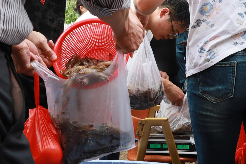 直播镜头聚焦在活明虾和香米等四款产品上。支教团成员笑容满面、声音洪亮,讲解细致入微。屏幕前,观众被精彩的内容吸引,纷纷留言互动。各农产品摊位前,邻里乡亲络绎不绝,暖风支教团成员穿梭其中,随机与摊主和顾客开启采访交流。在活明虾摊位,支教团采访了摊主,他表示从早上七点活动开始顾客就络绎不绝,仅上午就售出活虾百余斤。邻里乡亲们则表示本次活动推出的农产品物美价廉,真正实现了优质优价、惠民便民。