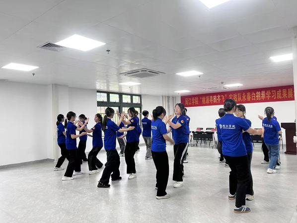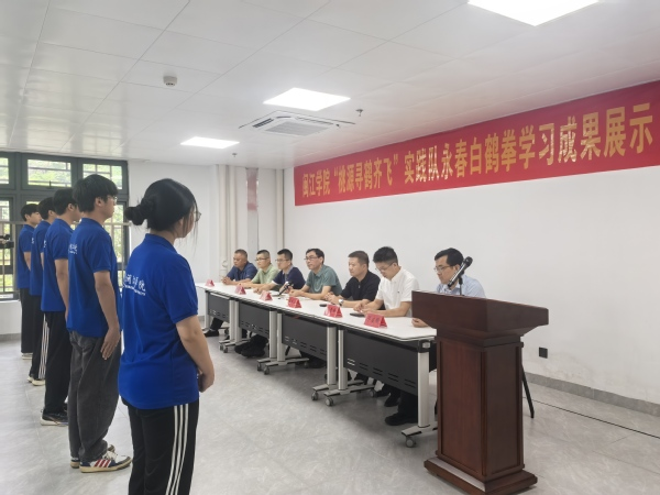 在实践成果汇报环节,20位实践队员表演了本次集中学习传承永春白鹤拳的成果,在悠扬慷慨《白鹤起舞在永春》的音乐中,同学们打出了“七步三战”和“十三步摇”两套母拳,展示永春白鹤拳的“刚柔并济”之道;接着,实践队队长苏妍通过PPT图文并茂汇报了此次实践专题调研的收获及问卷收集和初步分析情况,宣传组组长陈英姿通过5个短视频生动呈现了学习实践过程中的精彩片段、点滴感悟与团队风采。