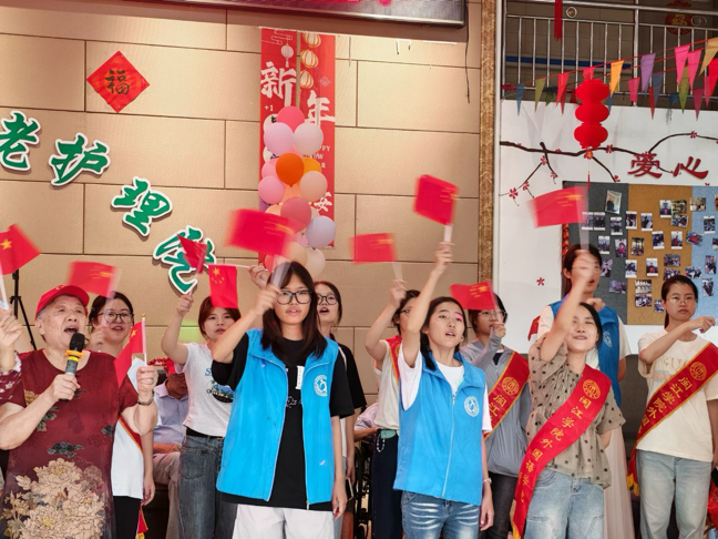 10月1日,正值国庆华诞,志愿者们以“青春告白祖国”为主题,为老人们献上一场精心编排的文艺展演。当《我爱你中国》的激昂旋律响起,老人们不约而同地跟着哼唱,家国情怀在歌声中传递。诗朗诵《中秋思念,青春中国》则以铿锵有力的语调,礼赞祖国发展成就,诉说青年一代的赤子之心。演出间隙,志愿者们与老人围坐在一起促膝畅谈,认真倾听他们的人生过往与时代记忆,让“家国同庆”的温情与祝福浸润人心。